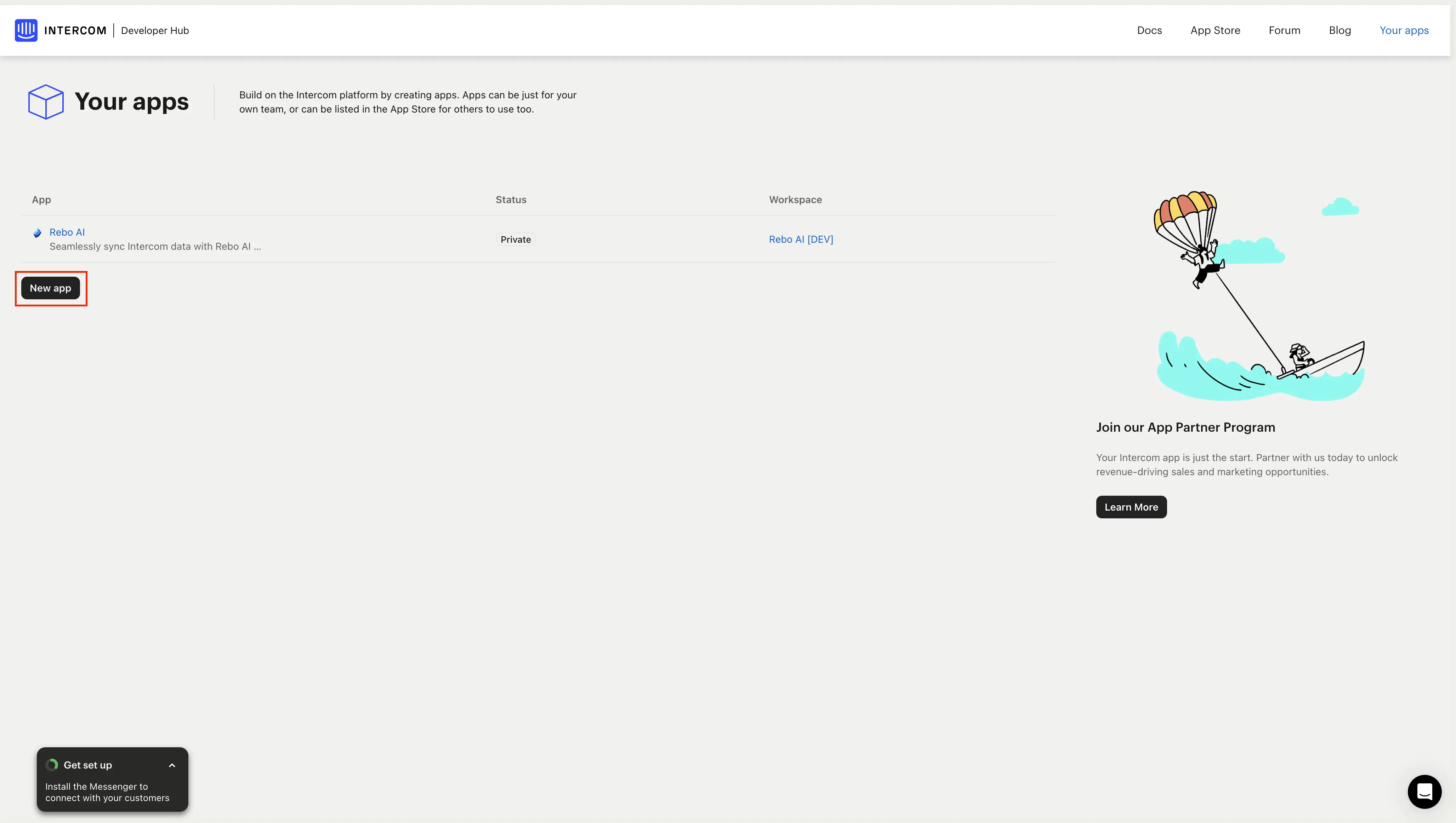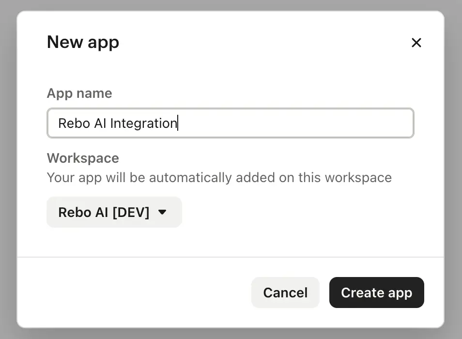 Click the Create App button. Example: Name your app “Rebo AI Integration”.